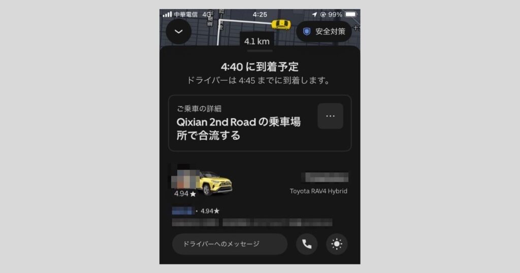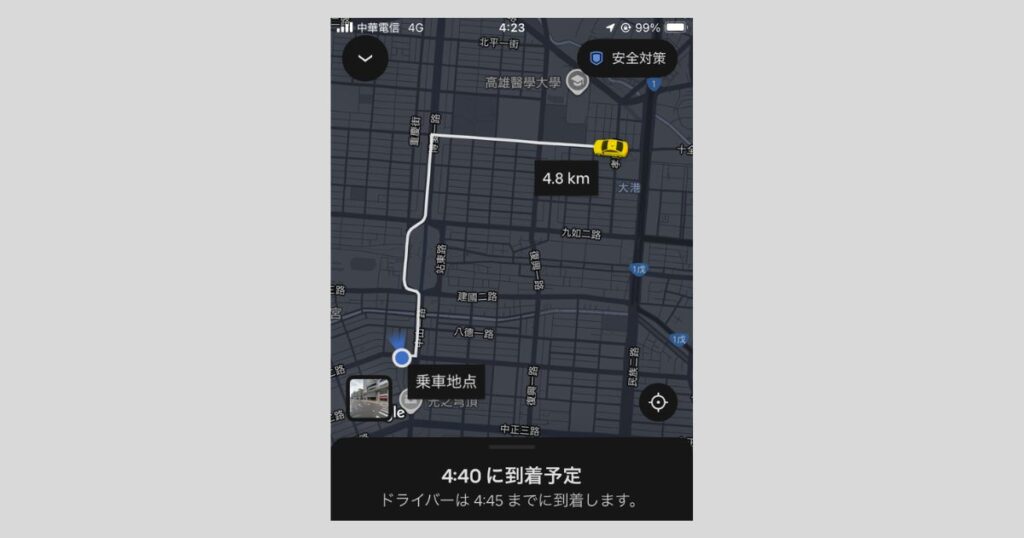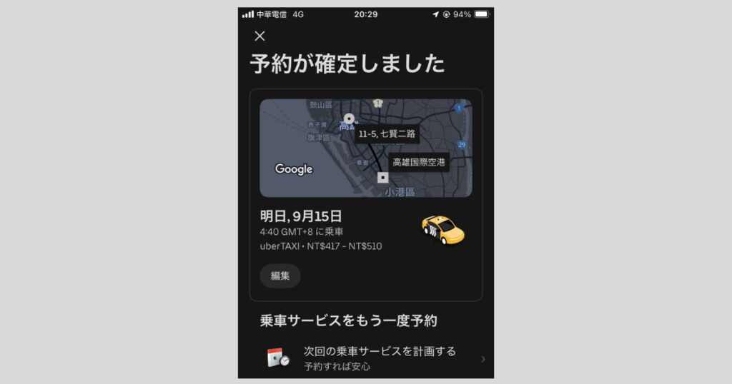 上記は、ホテルから高雄国際空港までの配車予約が完了した画面です。