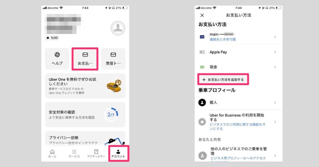 下のメニューから、「アカウント」を選択 > 「+お支払い方法を追加する」をタップしましょう。