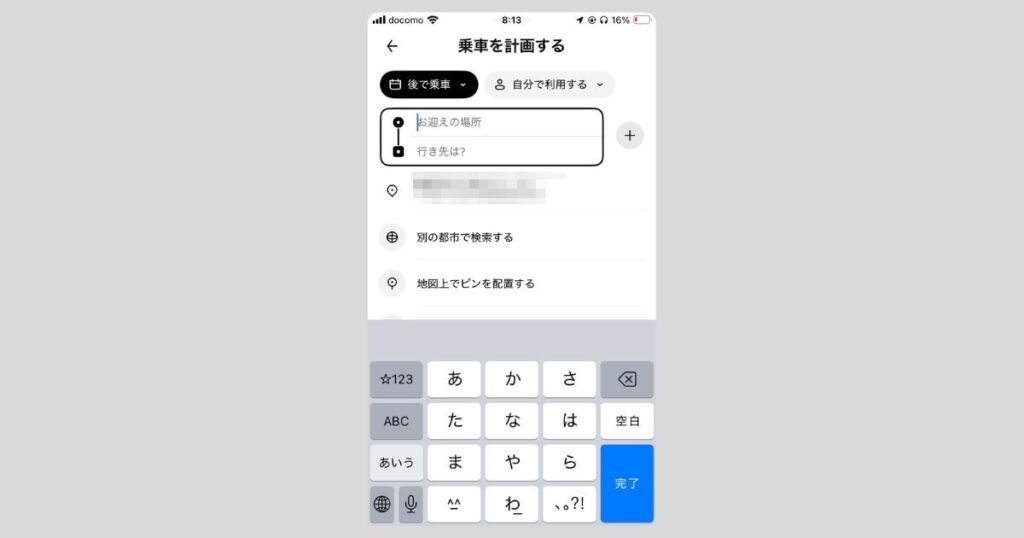 「お迎えの場所」と「行き先」を入力します。