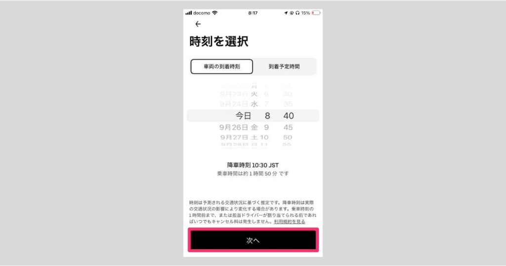 さらに、「Uberに来てもらう時間」または「目的への到着時間」を選択して「次へ」ボタンをタップ。